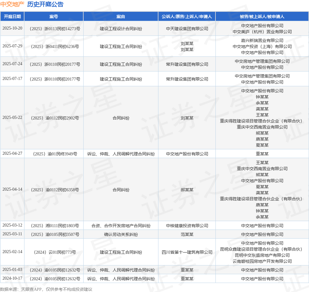 案号:(2025)浙0113民初14273号根据统计,近一年内以中交地产股份有限公司为当事人的历史开庭公告有12则,其中案由为“建设工程施工合同纠纷”的公告以4则居首,其次为“诉讼、仲裁、人民调解代理合同纠纷”有3则,“合同纠纷”有2则。历史开庭公告如下: