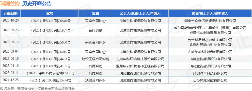 案号:(2025)浙0303民初6840号根据统计,近一年内以瑞浦兰钧能源股份有限公司为当事人的历史开庭公告有8则,其中案由为“买卖合同纠纷”的公告以3则居首,其次为“合同纠纷”有3则,“建设工程合同纠纷”有1则。历史开庭公告如下: