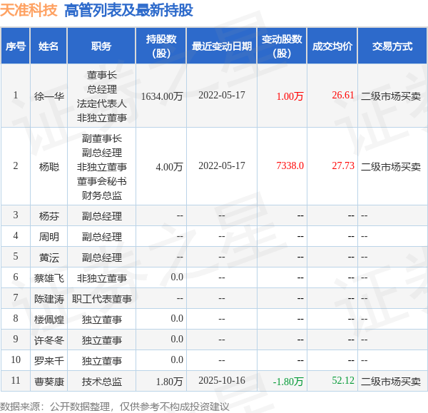 天准科技近半年内的董监高及核心技术人员增减持详情如下: