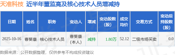 证券之星消息,根据10月17日市场公开信息、上市公司公告及交易所披露数据整理,天准科技(688003)最新董监高及相关人员股份变动情况:2025年10月16日公司核心技术人员曹葵康共减持公司股份1.8万股,占公司总股本为0.0093%。变动期间公司股价下跌0.93%,10月16日当日收盘报52.34元。