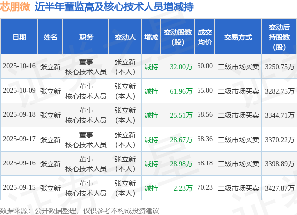 证券之星消息,根据10月17日市场公开信息、上市公司公告及交易所披露数据整理,芯朋微(688508)最新董监高及相关人员股份变动情况:2025年10月16日公司董事,核心技术人员张立新共减持公司股份32.0万股,占公司总股本为0.2437%。变动期间公司股价下跌1.28%,10月16日当日收盘报65.78元。