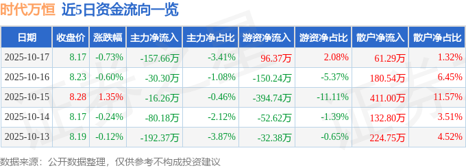 10月17日的资金流向数据方面,主力资金净流出157.66万元,占总成交额3.41%,游资资金净流入96.37万元,占总成交额2.08%,散户资金净流入61.29万元,占总成交额1.32%。
