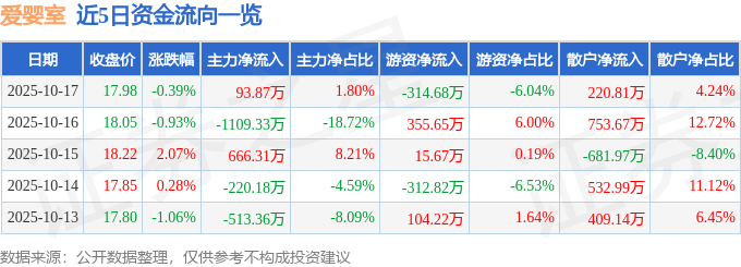 证券之星消息,截至2025年10月17日收盘,爱婴室(603214)报收于17.98元,下跌0.39%,换手率2.08%,成交量2.89万手,成交额5212.96万元。