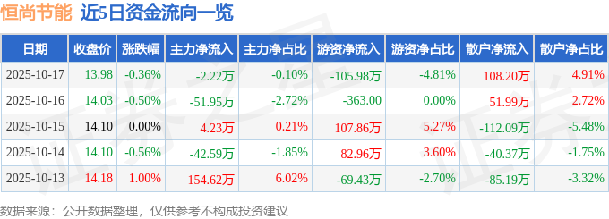 证券之星消息,截至2025年10月17日收盘,恒尚节能(603137)报收于13.98元,下跌0.36%,换手率2.14%,成交量1.58万手,成交额2205.49万元。