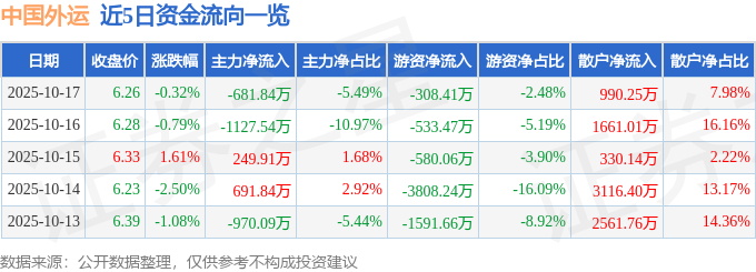 证券之星消息,截至2025年10月17日收盘,中国外运(601598)报收于6.26元,下跌0.32%,换手率0.38%,成交量19.78万手,成交额1.24亿元。