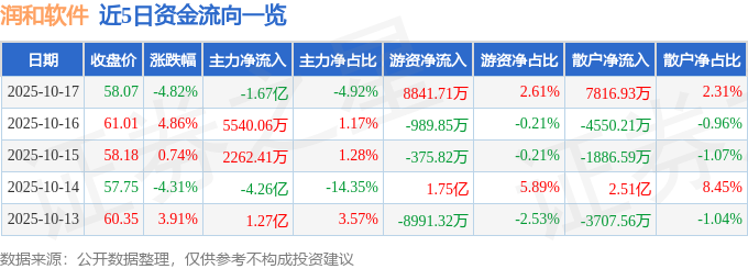 证券之星消息,截至2025年10月17日收盘,润和软件(300339)报收于58.07元,下跌4.82%,换手率7.24%,成交量56.3万手,成交额33.84亿元。
