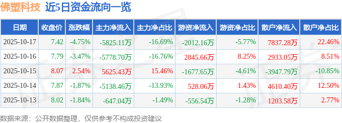 证券之星消息,截至2025年10月17日收盘,佛塑科技(000973)报收于7.42元,下跌4.75%,换手率4.77%,成交量46.11万手,成交额3.49亿元。