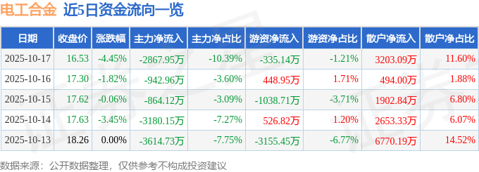证券之星消息,截至2025年10月17日收盘,电工合金(300697)报收于16.53元,下跌4.45%,换手率4.92%,成交量16.31万手,成交额2.76亿元。