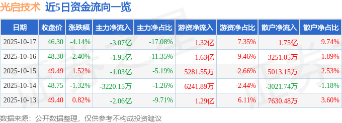证券之星消息,截至2025年10月17日收盘,光启技术(002625)报收于46.3元,下跌4.14%,换手率1.76%,成交量38.02万手,成交额17.96亿元。