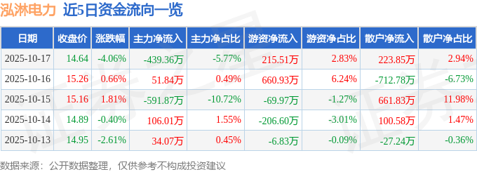证券之星消息,截至2025年10月17日收盘,泓淋电力(301439)报收于14.64元,下跌4.06%,换手率2.79%,成交量5.11万手,成交额7616.78万元。