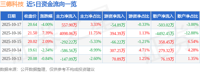 证券之星消息,截至2025年10月17日收盘,三德科技(300515)报收于20.64元,下跌4.0%,换手率3.97%,成交量8.01万手,成交额1.68亿元。