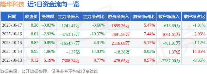 证券之星消息,截至2025年10月17日收盘,隆华科技(300263)报收于8.28元,下跌3.83%,换手率4.1%,成交量39.99万手,成交额3.39亿元。