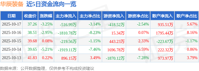 证券之星消息,截至2025年10月17日收盘,华辰装备(300809)报收于37.26元,下跌3.25%,换手率2.91%,成交量4.37万手,成交额1.65亿元。
