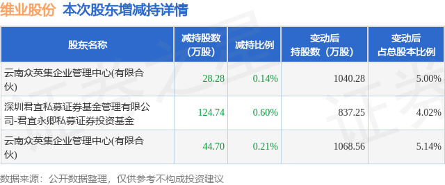 证券之星消息,10月17日维业股份发布公告《维业股份:维业建设集团股份有限公司简式权益变动报告书》,其股东云南众英集企业管理中心(有限合伙)、深圳君宜私募证券基金管理有限公司-君宜永卿私募证券投资基金于2025年7月1日至2025年10月15日间合计减持197.72万股,占公司目前总股本的0.9502%,变动期间该股股价上涨1.69%,截止10月15日收盘报9.04元。