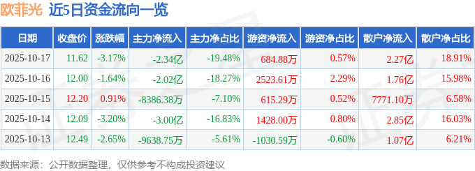 证券之星消息,截至2025年10月17日收盘,欧菲光(002456)报收于11.62元,下跌3.17%,换手率3.08%,成交量102.01万手,成交额12.0亿元。