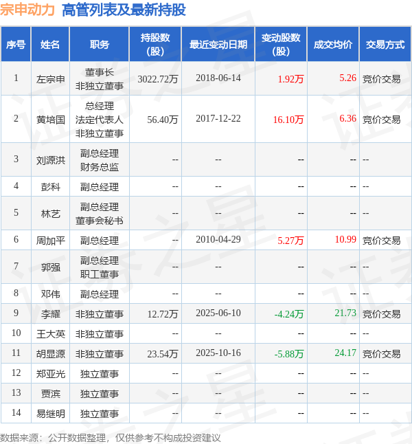 宗申动力的高管列表及最新持股情况如下: