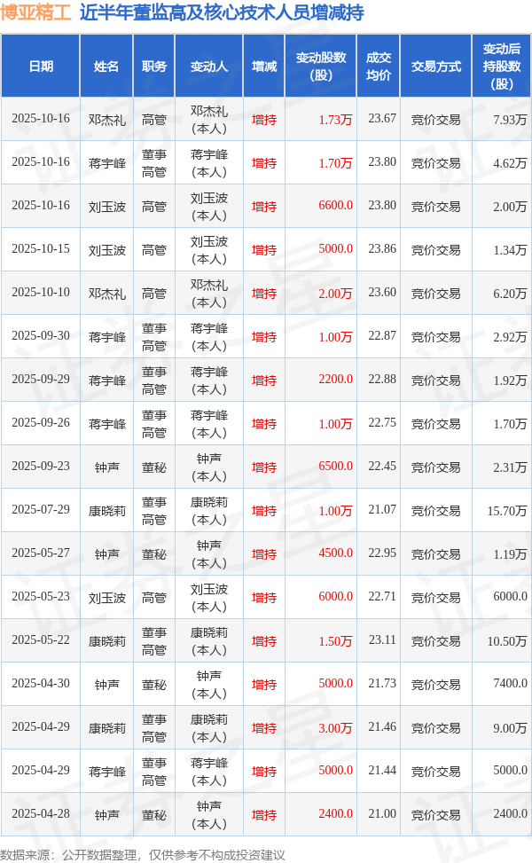 博亚精工近半年内的董监高及核心技术人员增减持详情如下: