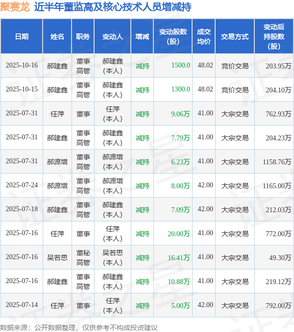 聚赛龙近半年内的董监高及核心技术人员增减持详情如下:
