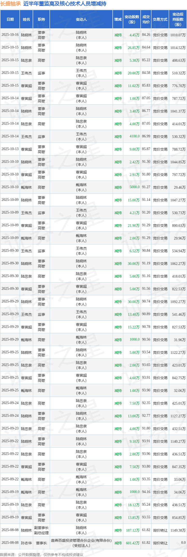 长盛轴承近半年内的董监高及核心技术人员增减持详情如下: