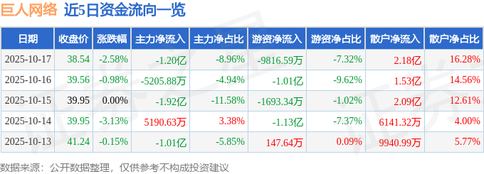 证券之星消息,截至2025年10月17日收盘,巨人网络(002558)报收于38.54元,下跌2.58%,换手率1.77%,成交量34.24万手,成交额13.4亿元。