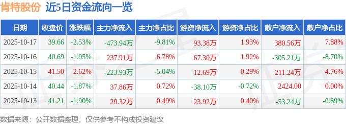 证券之星消息,截至2025年10月17日收盘,肯特股份(301591)报收于39.66元,下跌2.53%,换手率3.55%,成交量1.2万手,成交额4832.43万元。