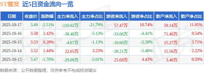 证券之星消息,截至2025年10月17日收盘,ST雪发(002485)报收于3.49元,下跌2.51%,换手率0.28%,成交量1.53万手,成交额535.3万元。