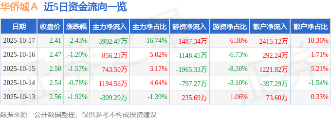 证券之星消息,截至2025年10月17日收盘,华侨城A(000069)报收于2.41元,下跌2.43%,换手率1.38%,成交量95.41万手,成交额2.33亿元。