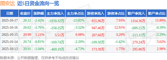 证券之星消息,截至2025年10月17日收盘,国安达(300902)报收于20.12元,下跌2.42%,换手率3.35%,成交量4.06万手,成交额8271.61万元。