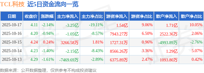 证券之星消息,截至2025年10月17日收盘,TCL科技(000100)报收于4.11元,下跌2.14%,换手率2.27%,成交量410.25万手,成交额17.0亿元。
