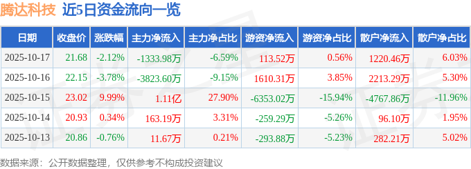 证券之星消息,截至2025年10月17日收盘,腾达科技(001379)报收于21.68元,下跌2.12%,换手率13.73%,成交量9.24万手,成交额2.02亿元。