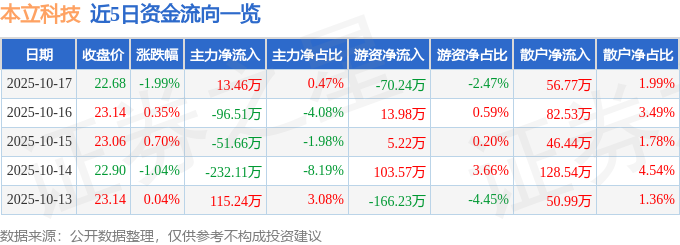 证券之星消息,截至2025年10月17日收盘,本立科技(301065)报收于22.68元,下跌1.99%,换手率1.44%,成交量1.24万手,成交额2847.19万元。