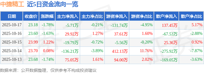 10月17日的资金流向数据方面,主力资金净流出5.71万元,占总成交额0.21%,游资资金净流出131.74万元,占总成交额4.95%,散户资金净流入137.45万元,占总成交额5.17%。