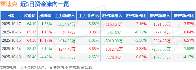 证券之星消息,截至2025年10月17日收盘,雷迪克(300652)报收于64.1元,下跌1.58%,换手率6.83%,成交量8.18万手,成交额5.38亿元。