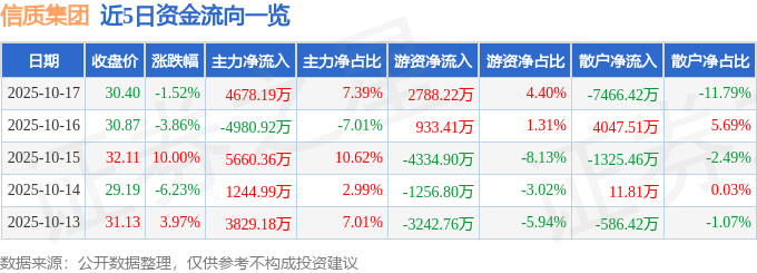 证券之星消息,截至2025年10月17日收盘,信质集团(002664)报收于30.4元,下跌1.52%,换手率5.05%,成交量20.34万手,成交额6.33亿元。