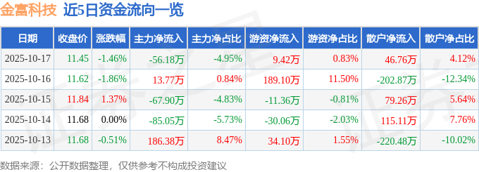 10月17日的资金流向数据方面,主力资金净流出56.18万元,占总成交额4.95%,游资资金净流入9.42万元,占总成交额0.83%,散户资金净流入46.76万元,占总成交额4.12%。