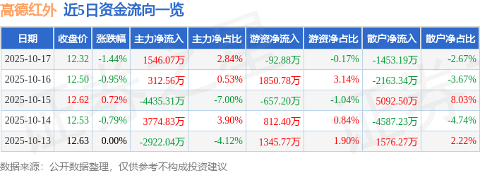 证券之星消息,截至2025年10月17日收盘,高德红外(002414)报收于12.32元,下跌1.44%,换手率1.3%,成交量44.03万手,成交额5.44亿元。