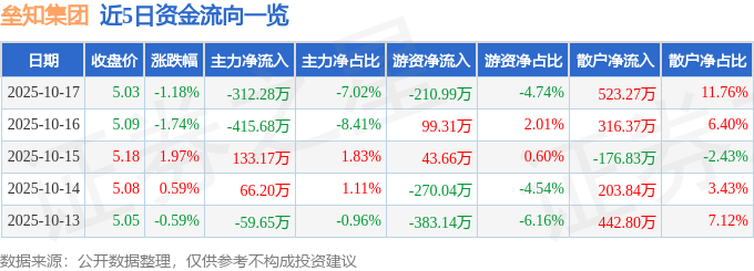 证券之星消息,截至2025年10月17日收盘,垒知集团(002398)报收于5.03元,下跌1.18%,换手率1.54%,成交量8.76万手,成交额4450.15万元。