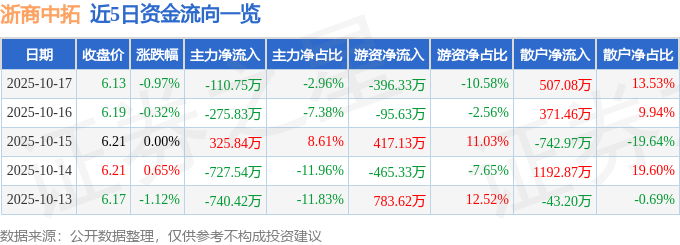 证券之星消息,截至2025年10月17日收盘,浙商中拓(000906)报收于6.13元,下跌0.97%,换手率0.87%,成交量6.07万手,成交额3747.62万元。