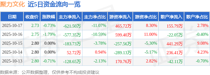 证券之星消息,截至2025年10月17日收盘,聚力文化(002247)报收于2.73元,下跌0.73%,换手率3.16%,成交量20.33万手,成交额5613.74万元。