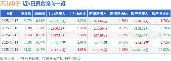 证券之星消息,截至2025年10月17日收盘,天山电子(301379)报收于30.79元,下跌0.61%,换手率15.73%,成交量20.03万手,成交额6.15亿元。