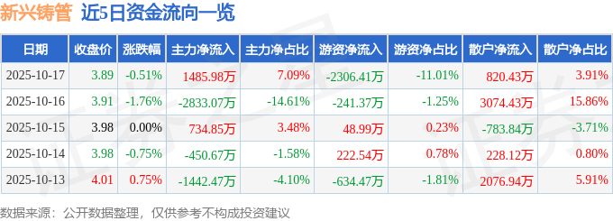 证券之星消息,截至2025年10月17日收盘,新兴铸管(000778)报收于3.89元,下跌0.51%,换手率1.37%,成交量53.36万手,成交额2.1亿元。