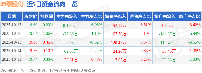 证券之星消息,截至2025年10月17日收盘,坤泰股份(001260)报收于19.6元,下跌0.2%,换手率4.19%,成交量1.33万手,成交额2621.43万元。