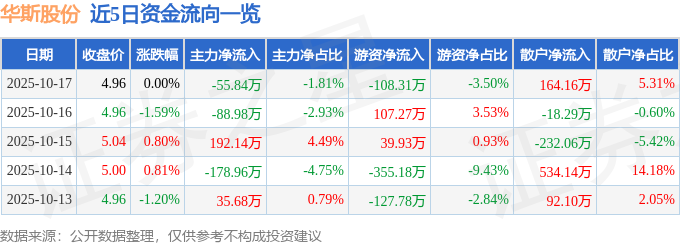 证券之星消息,截至2025年10月17日收盘,华斯股份(002494)报收于4.96元,上涨0.0%,换手率2.17%,成交量6.22万手,成交额3091.98万元。