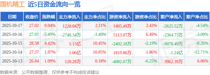 证券之星消息,截至2025年10月17日收盘,国机精工(002046)报收于27.02元,上涨0.04%,换手率4.01%,成交量21.22万手,成交额5.78亿元。
