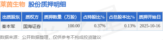 证券之星消息,莱茵生物(002166)10月18日公开信息显示,股东秦本军向国海证券合计质押100.0万股,占总股本0.13%。质押详情见下表: