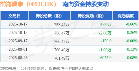 证券之星消息,10月17日南向资金减持5.0万股前海健康(00911.HK)。近5个交易日中,获南向资金减持的有5天,累计净减持8.62万股。近20个交易日中,获南向资金减持的有20天,累计净减持44.24万股。截至目前,南向资金持有前海健康(00911.HK)753.47万股,占公司已发行普通股的4.44%。