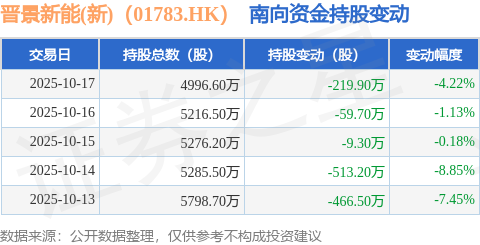 证券之星消息,10月17日南向资金减持219.9万股晋景新能(新)(01783.HK)。近5个交易日中,获南向资金减持的有5天,累计净减持1268.6万股。截至目前,南向资金持有晋景新能(新)(01783.HK)4996.6万股,占公司已发行普通股的1.77%。