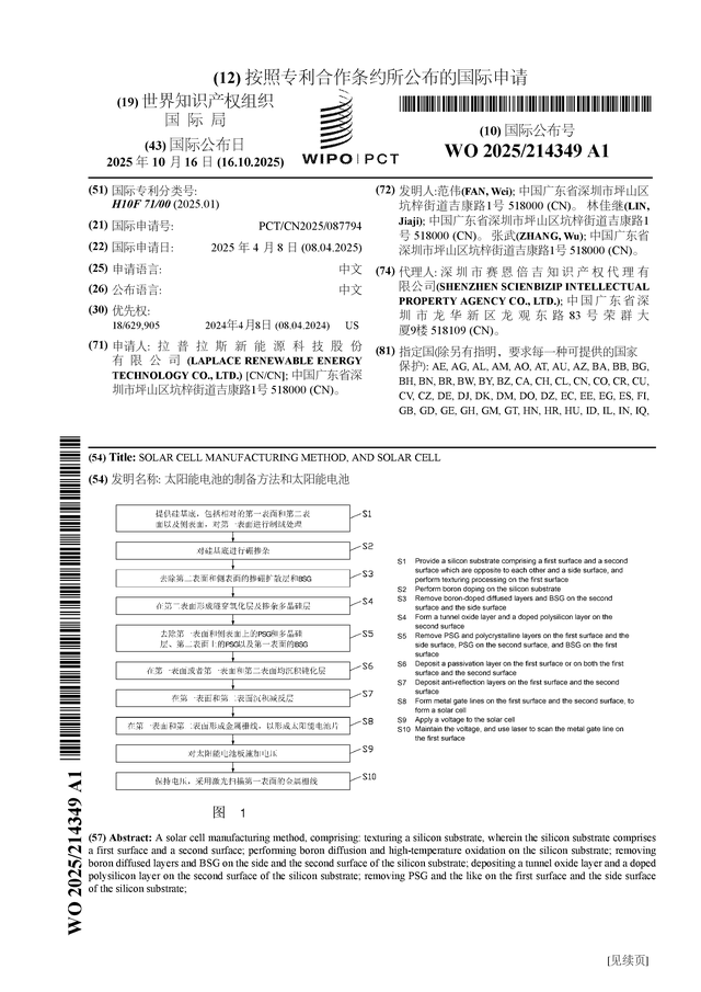 证券之星消息,根据企查查数据显示拉普拉斯(688726)公布了一项国际专利申请,专利名为“太阳能电池的制备方法和太阳能电池”,专利申请号为PCT/CN2025/087794,国际公布日为2025年10月16日。