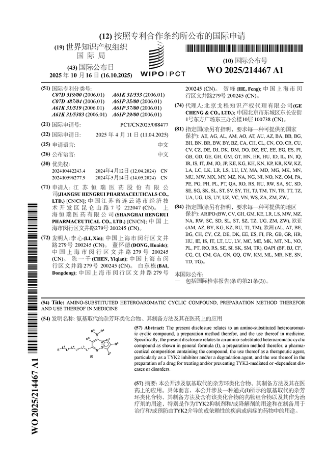 证券之星消息,根据企查查数据显示恒瑞医药(600276)公布了一项国际专利申请,专利名为“氨基取代的杂芳环类化合物、其制备方法及其在医药上的应用”,专利申请号为PCT/CN2025/088477,国际公布日为2025年10月16日。