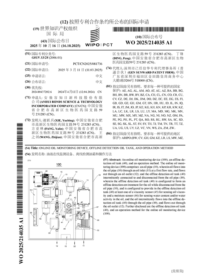 证券之星消息,根据企查查数据显示容知日新(688768)公布了一项国际专利申请,专利名为“油液在线监测设备、离线检测油箱和操作方法”,专利申请号为PCT/CN2025/081736,国际公布日为2025年10月16日。